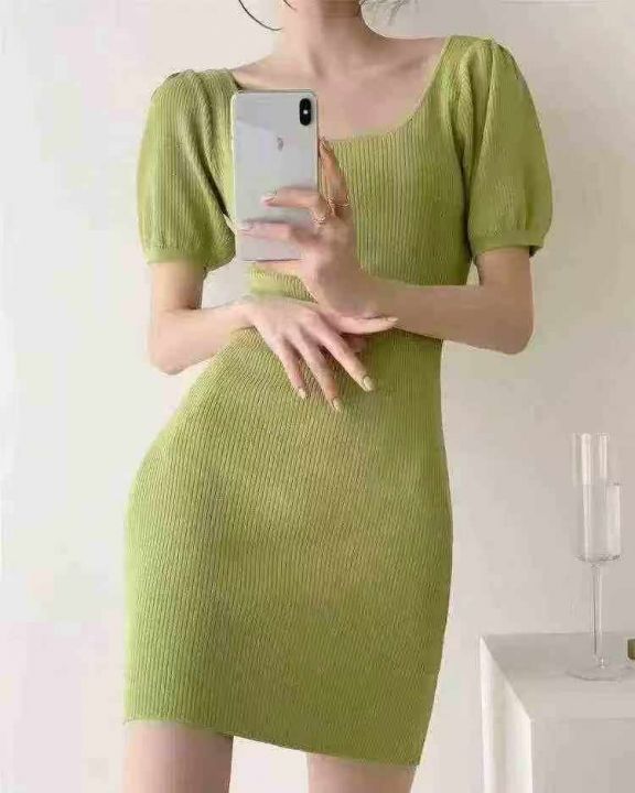 夏季新款法式减龄泡泡袖短袖弹力修身显瘦针织连衣裙,黑色多,独立包装,33...
