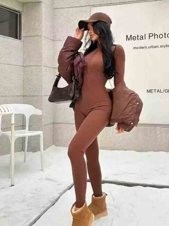 5.8清欧美ins风纯欲性感气质拉链半开领长袖连体衣裤,整款三色,数量170条...
