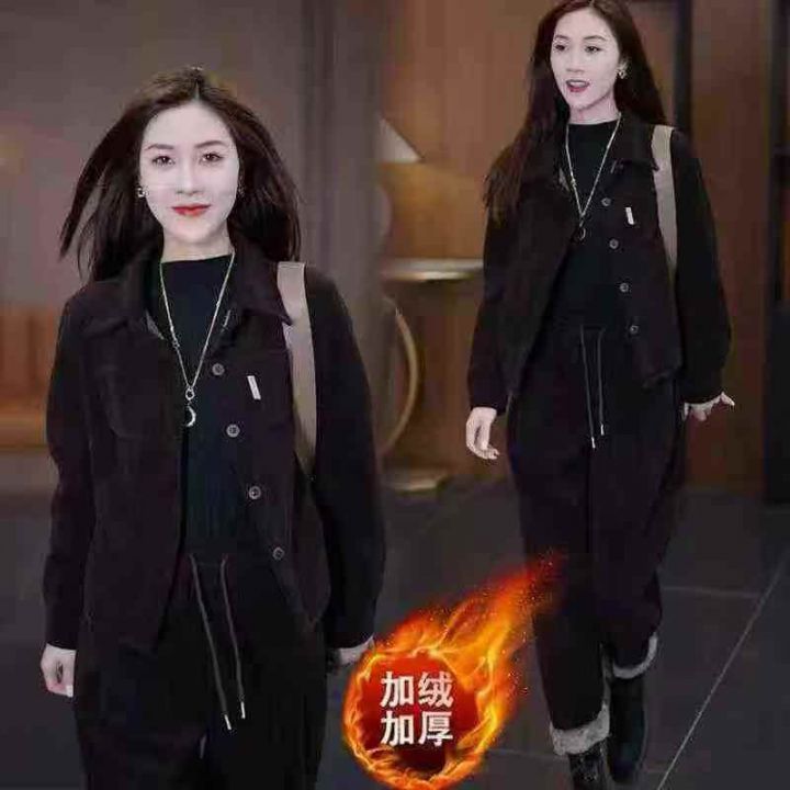 翻领灯芯绒保暖套装女2025冬季加绒加厚宽松显瘦卫衣直...