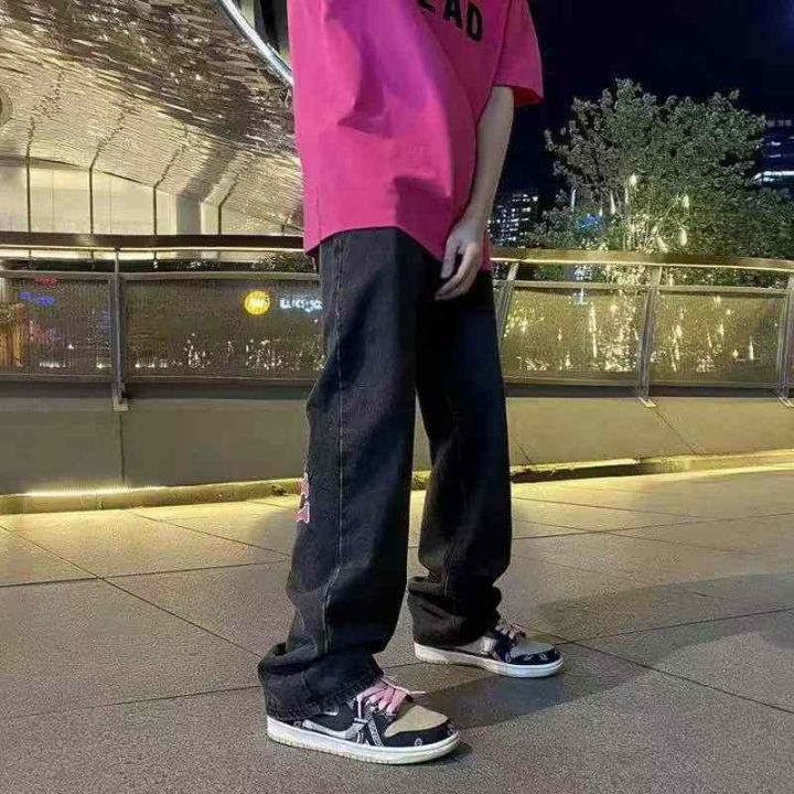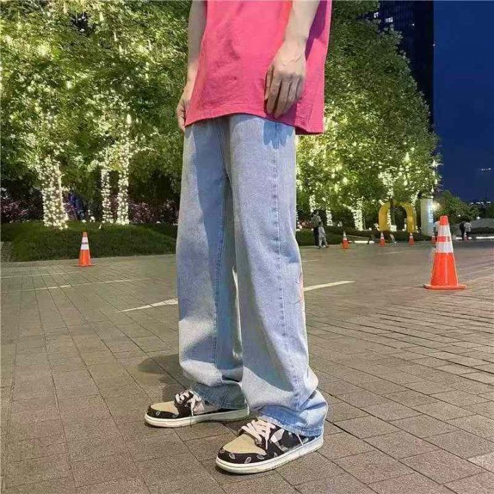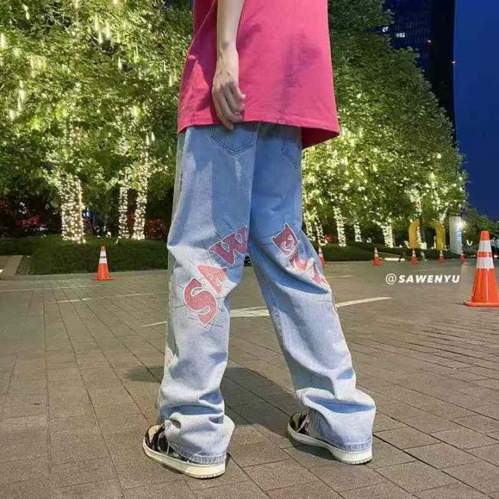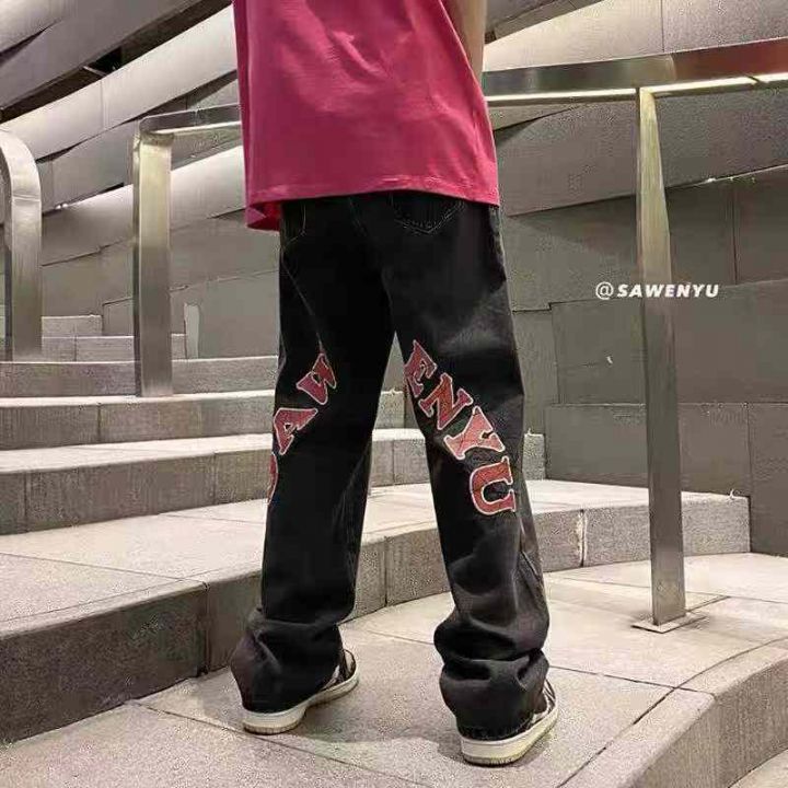 秋冬新款美式复古男士设计款印花直筒牛仔长裤,独立包...