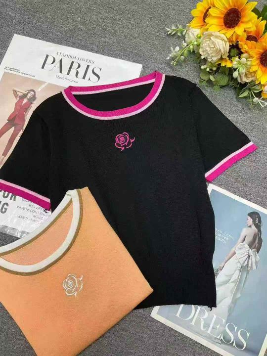 夏季新款撞色边玫瑰刺绣收腰显瘦针织短袖t桖,独立包装,均码面料柔软舒适弹力大,180件,全清6.9元超低价秒杀!。 货号:1303