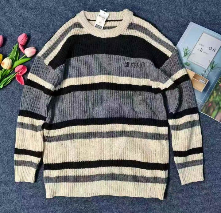 ☆8.8元,秋冬季慵懒风情侣百搭条纹宽松圆领毛衣,男女同款,100件,M-2XL,独立包装吊牌,全清8.8元。 货号:1303