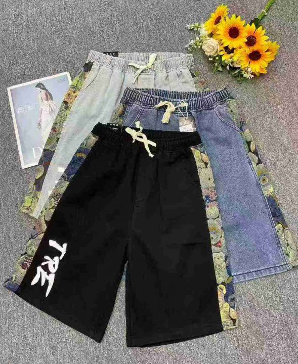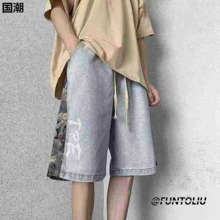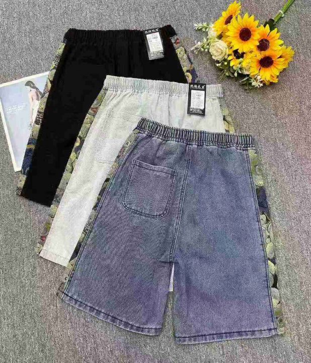 夏季新款洗水棉网红腰花果拼接设计款松紧腰男士牛仔短...