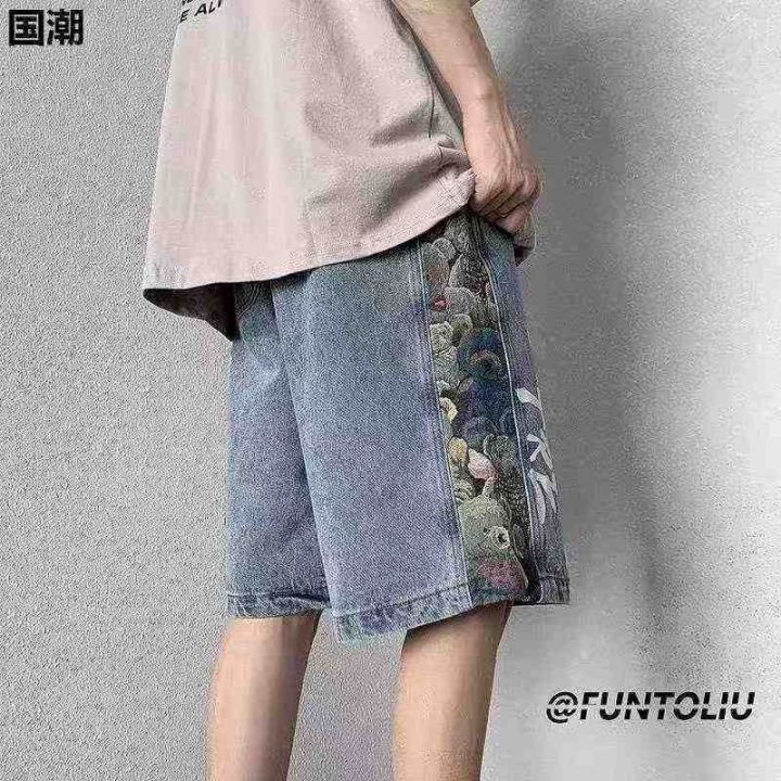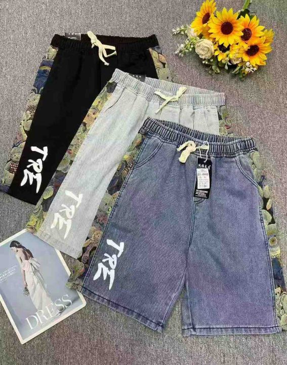 夏季新款洗水棉网红腰花果拼接设计款松紧腰男士牛仔短...