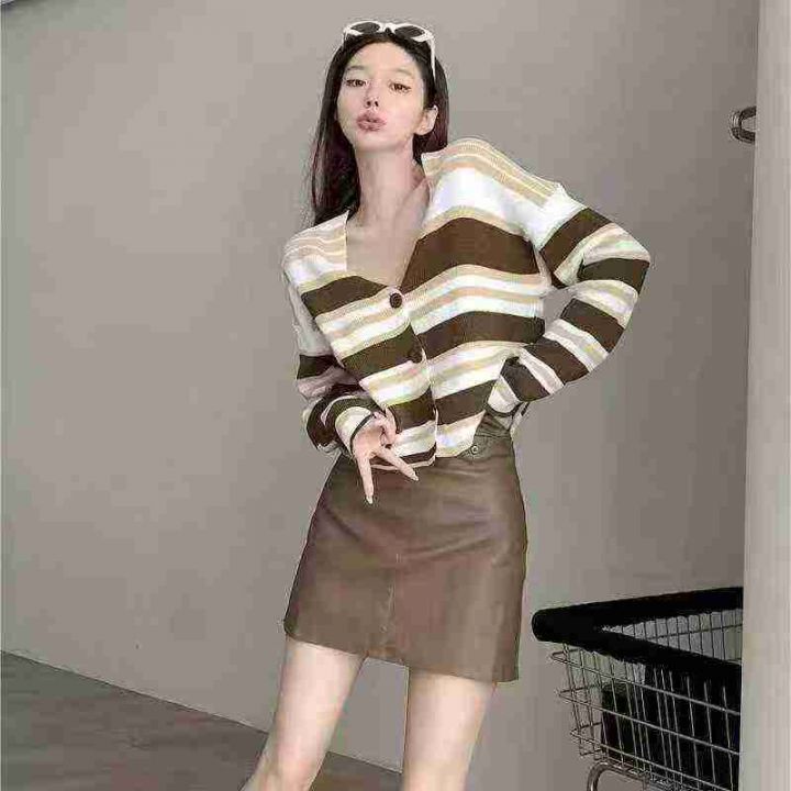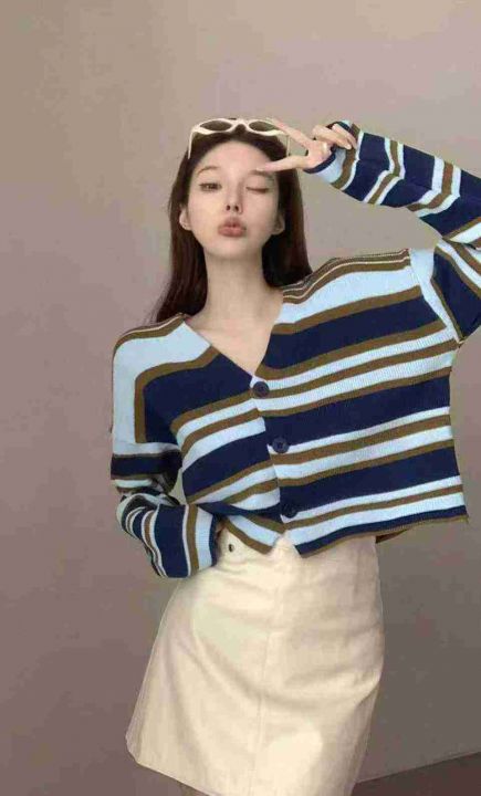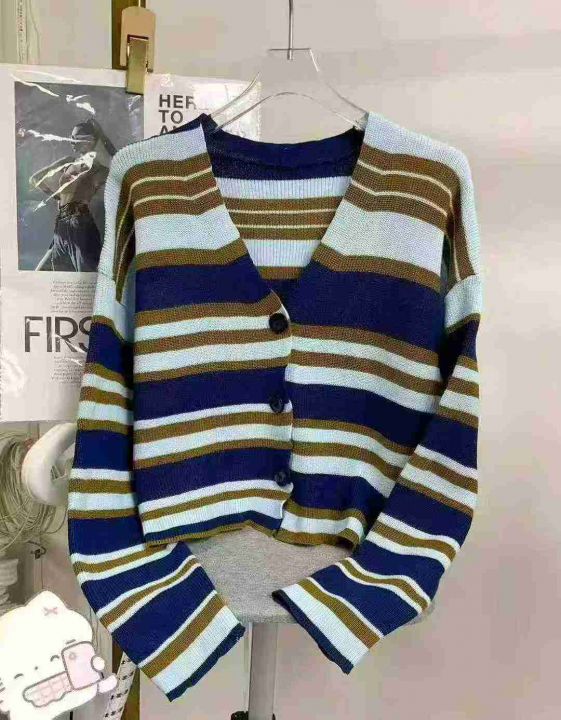 秋季新品软糯撞色条纹宽松慵懒风百搭针织毛衣开衫,独...
