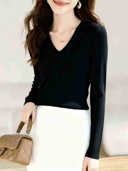 秋冬新款法式V领弹力修身高级显瘦气质打底通勤包芯纱...