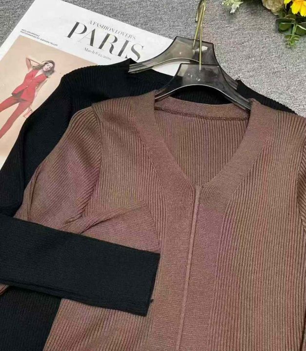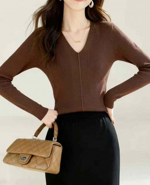 秋冬新款法式V领弹力修身高级显瘦气质打底通勤包芯纱...