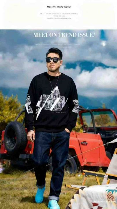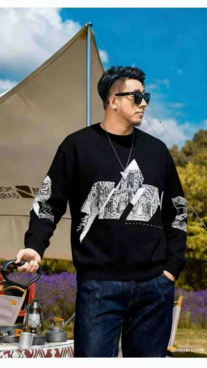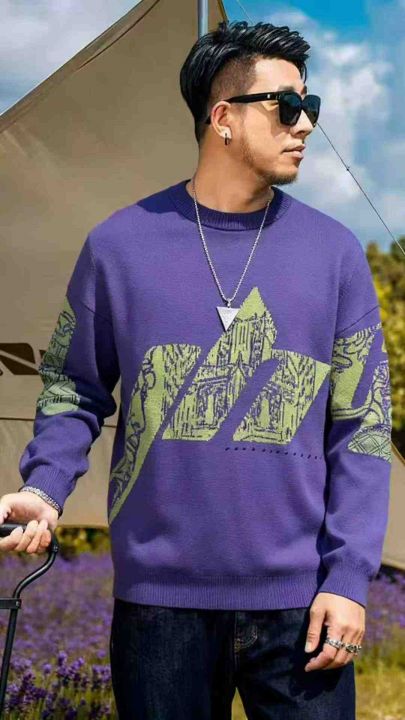 秋冬新款男士潮牌宽松慵懒风提花包芯纱圆领套头毛衣,...