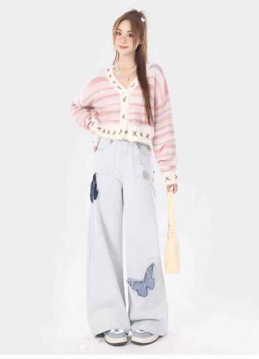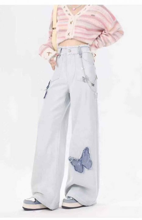 天猫精选1800条 时尚洋气国潮蓝色蝴蝶刺绣毛边阔腿牛...