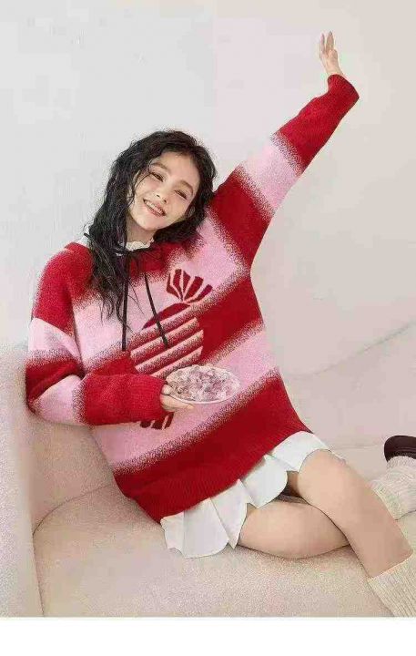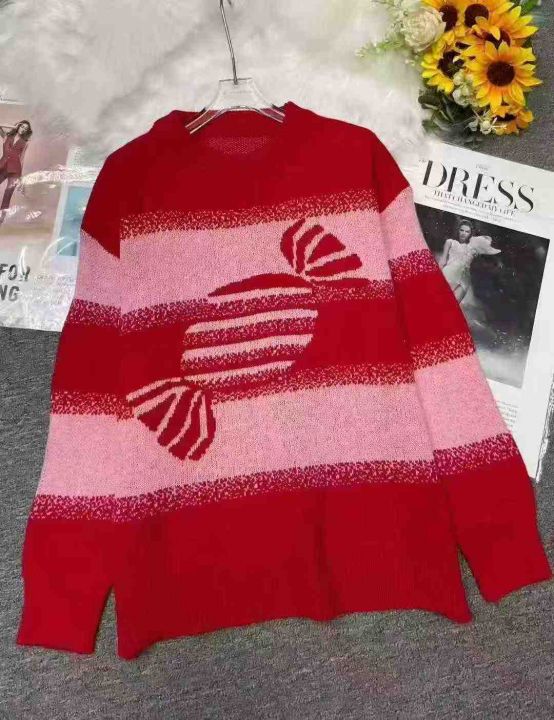 秋冬新款宽松慵懒风乐町草莓奶糖新年红氛围感包芯纱提花钻进套头毛衣,独立...