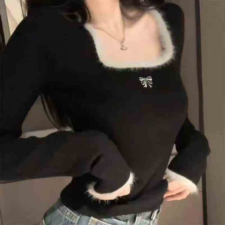 早秋新款小香风撞色刺绣减龄百搭拼接水貂毛设计款套头...