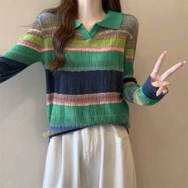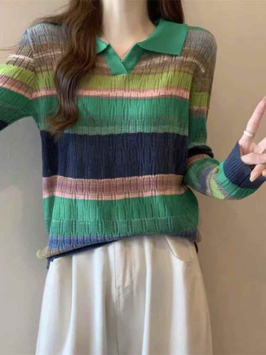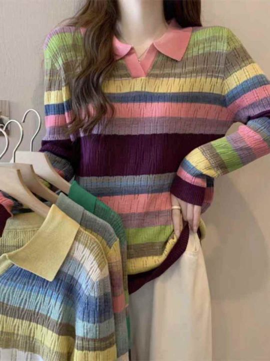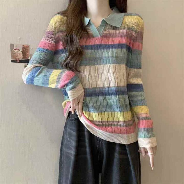 秋季新款POLO领撞色彩虹条纹微胖MM设计感时尚宽松长袖套头毛衣羊毛衫,独立包装,均码宽松款面料软糯Q弹,1800件,全清8.9元超低价秒杀!分货加一!。 货号:1303
