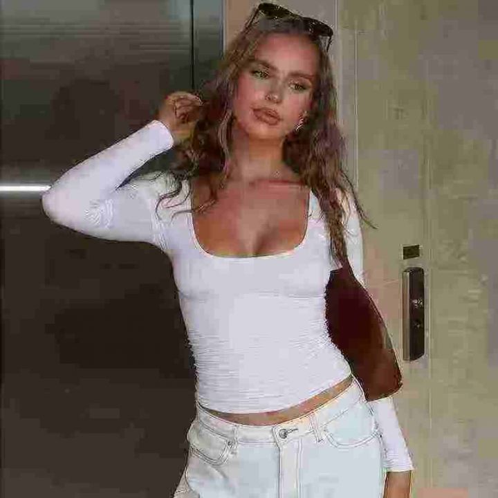 5851件,女早秋季纯色百搭U领长袖T恤上衣女弹力修身高...