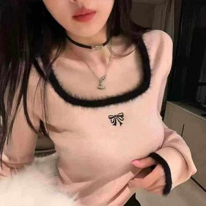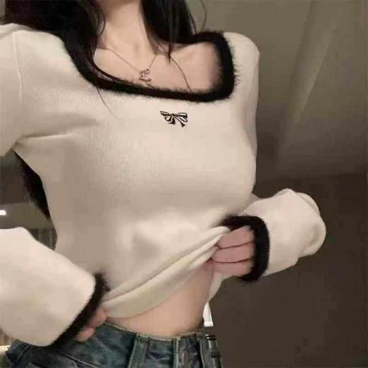 早秋新款小香风撞色刺绣减龄百搭拼接水貂毛设计款套头...