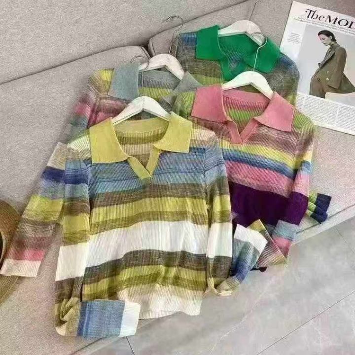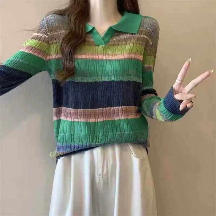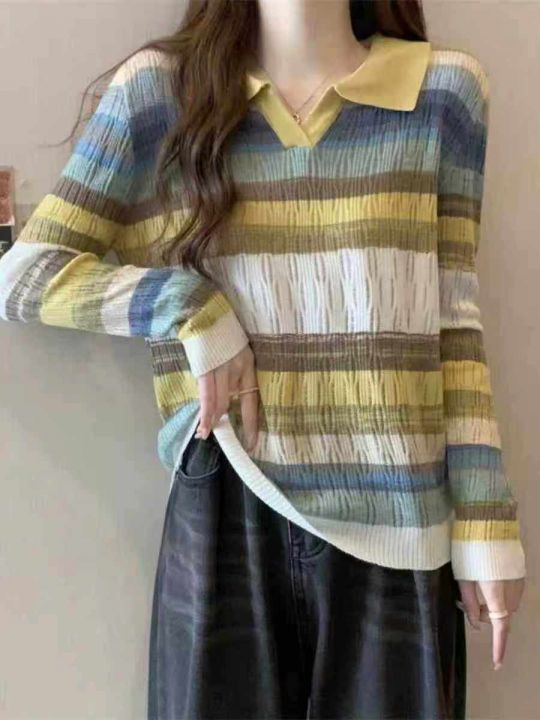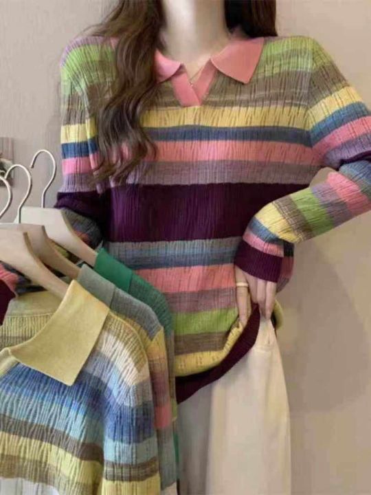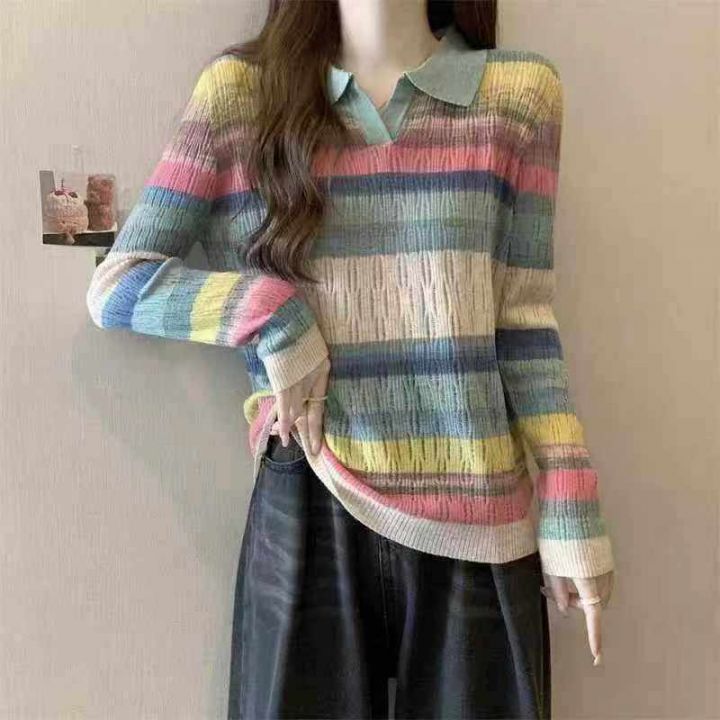 秋季新款POLO领撞色彩虹条纹微胖MM设计感时尚宽松长袖套头毛衣羊毛衫,独立包装,均码宽松款面料软糯Q弹,1800件,全清8.9元超低价秒杀!分货加一!