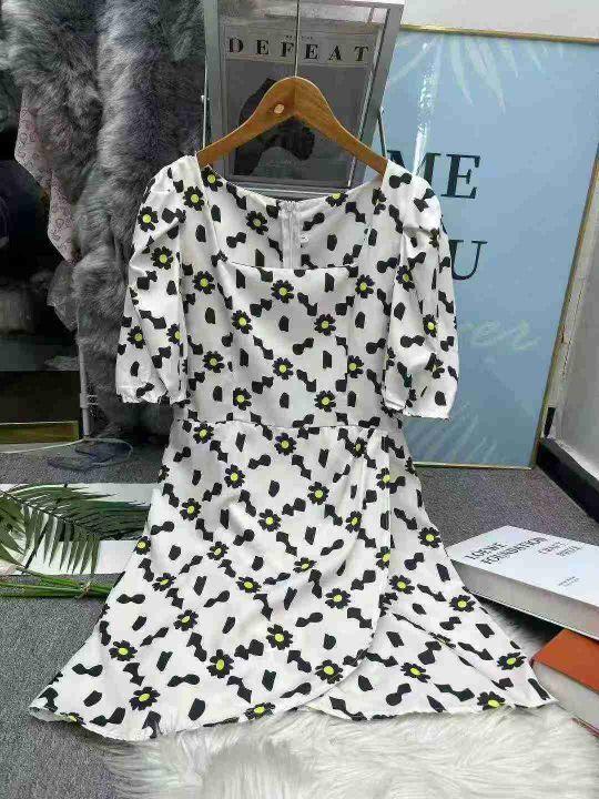 热卖雏菊泡泡袖名媛气质显瘦短袖裙方领设计感连衣裙,独立包装,码数1-5码,数量550条,分货加1,(货号0913#45)