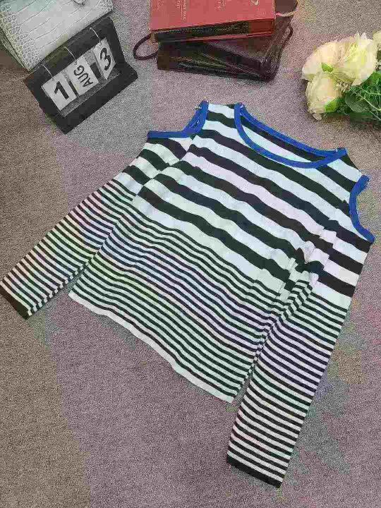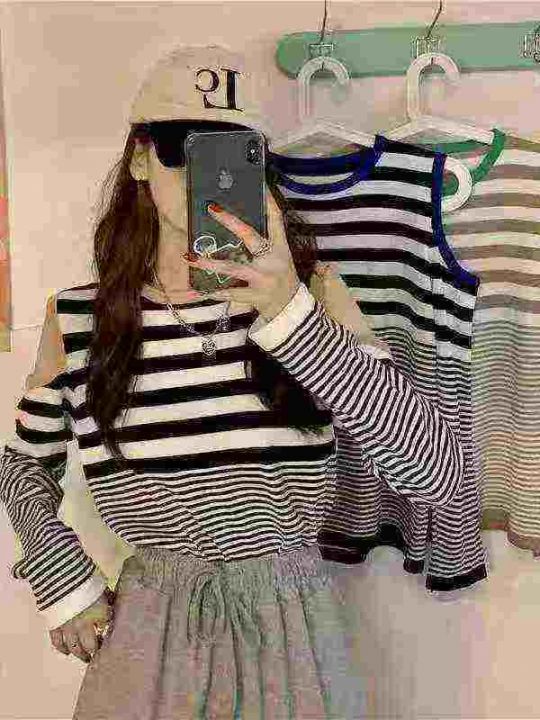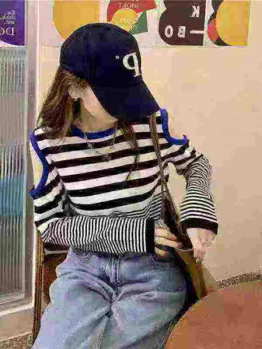 三色入!配色绝绝子~春秋百搭宽松黑白条露肩圆领毛针...