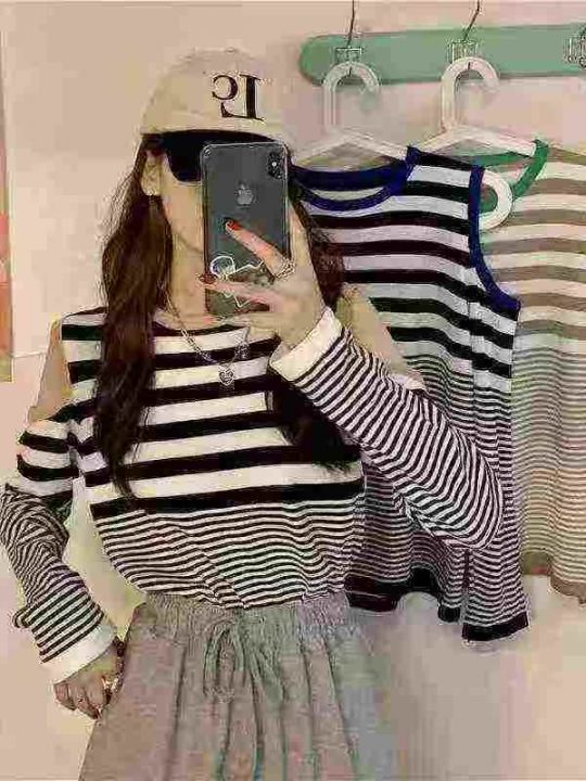三色入!配色绝绝子~春秋百搭宽松黑白条露肩圆领毛针...