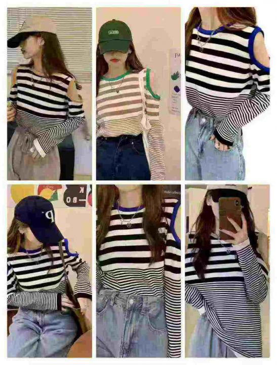 三色入!配色绝绝子~春秋百搭宽松黑白条露肩圆领毛针...