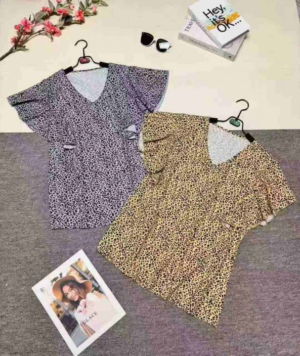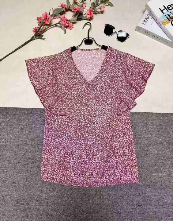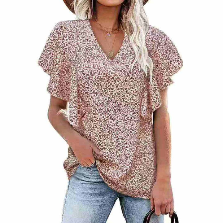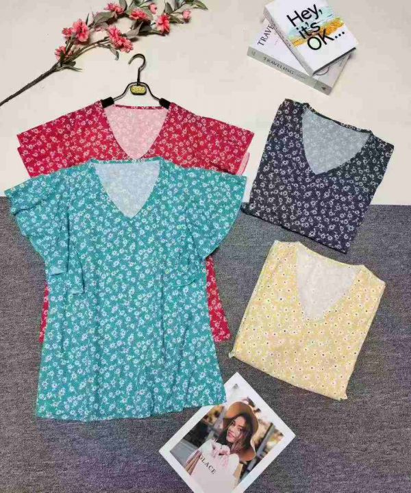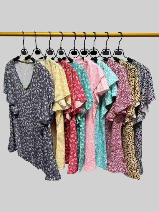 700件欧美时尚休闲V领印花荷叶边袖口短袖,整款,花型图案多,品质好,独立包装。s到5XL。梭织面料。亏本清。3.9