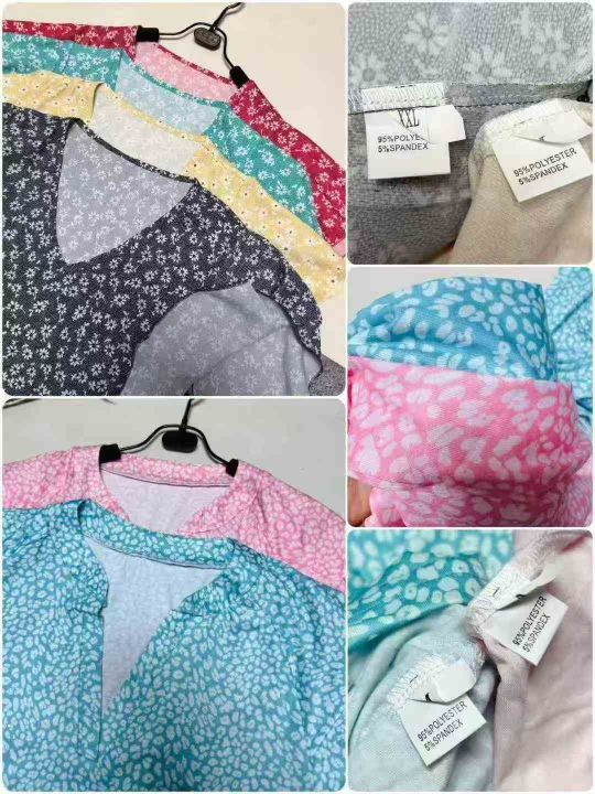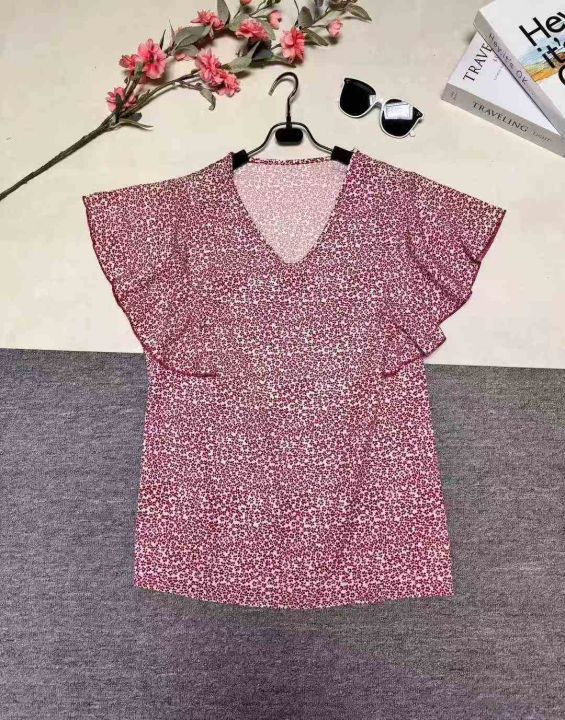 700件欧美时尚休闲V领印花荷叶边袖口短袖,整款,花型图案多,品质好,独立包装。s到5XL。梭织面料。亏本清。3.9。 货号:1323