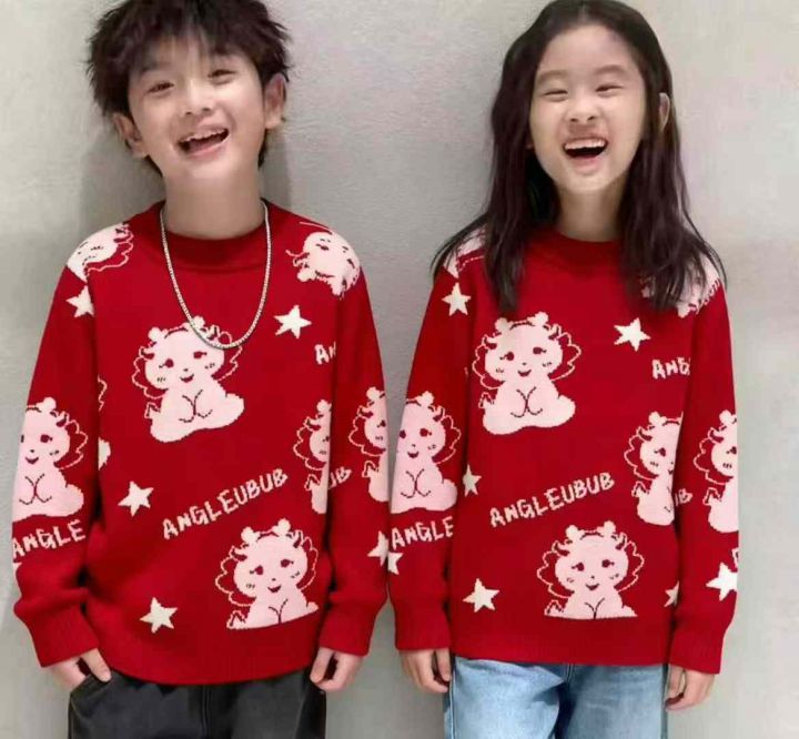 秋冬新款男女童中大童童装复古本命年红色提花包芯纱圆领套头毛衣,独立包装带吊牌,码数110-150码,445件,全清7.9元超低价秒杀!分货加一!