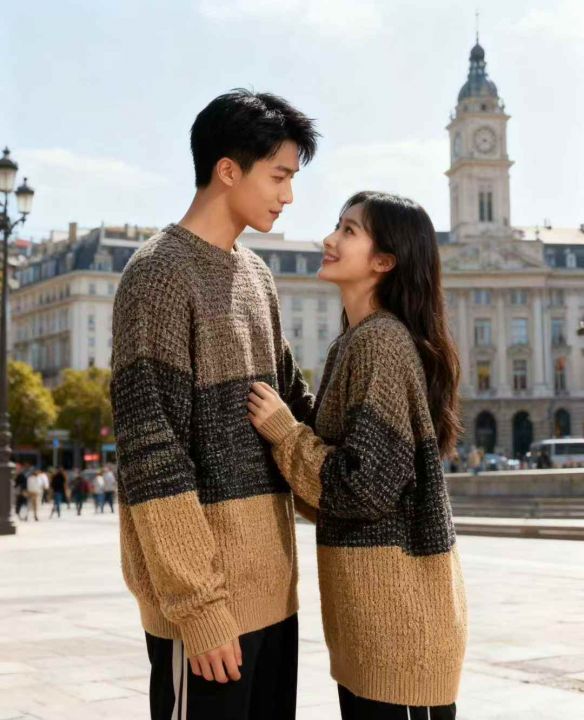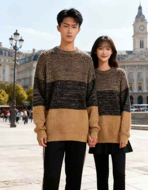 秋冬新款宽松慵懒风男女同款撞色条纹套头毛衣,独立包...