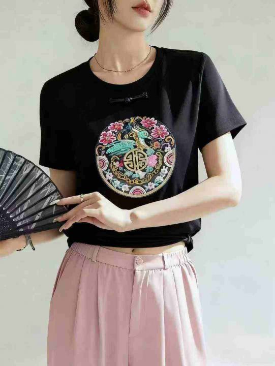 1625件国风重工刺绣中式盘扣拉架棉短袖T恤女,以黑色...