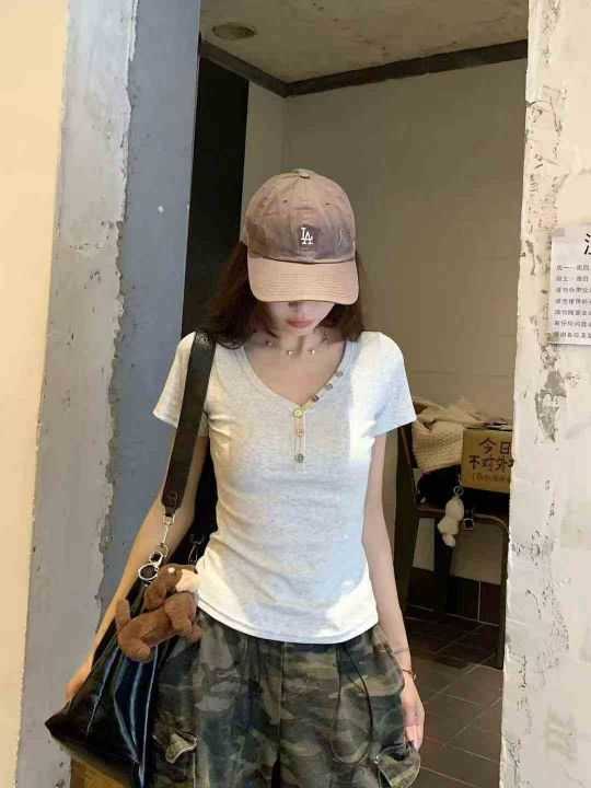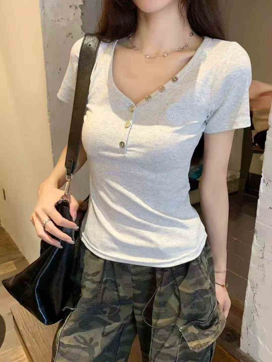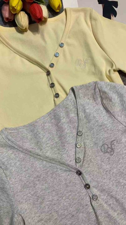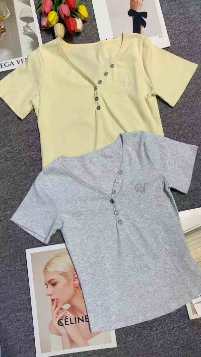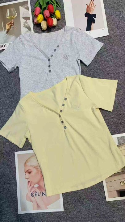 韩版V领扭扣设计字母刺绣修身显瘦上衣,[爱心]130件左右,灰白色为主,款号#1062,码数S-XL,穿70-120斤,万佳档口货,原包装️无瑕疵,[666]实体店品质。 货号:1323