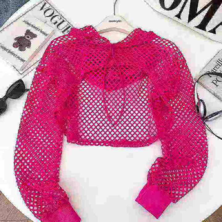 299件2025夏季新款欧美风百搭镂空连帽长袖宽松显瘦短款防晒罩衫上衣女,单款三色,L码(100-135斤可穿) 三件一袋装。