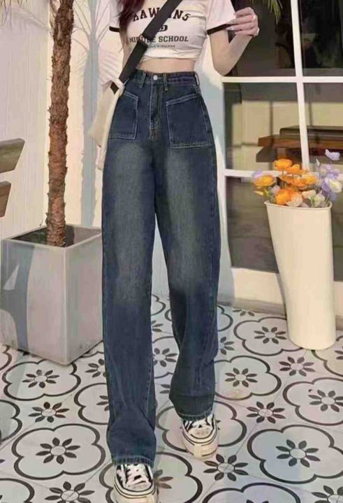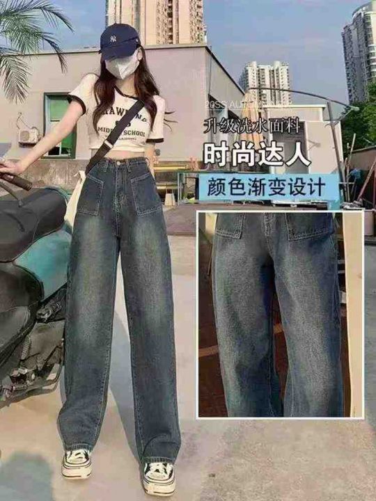 春秋新款宽松高腰洗水棉直筒阔腿牛仔裤独立包装带腰卡...