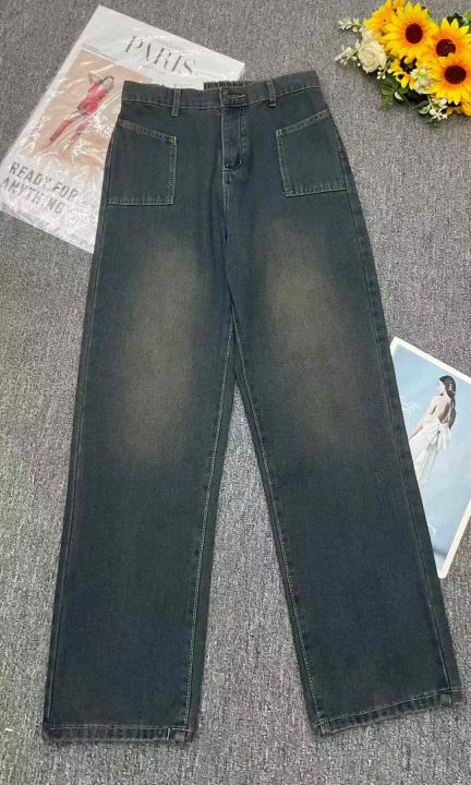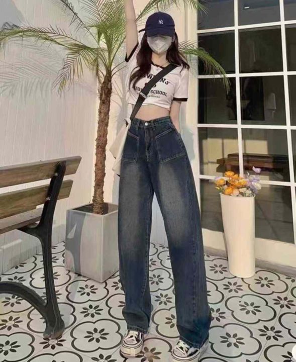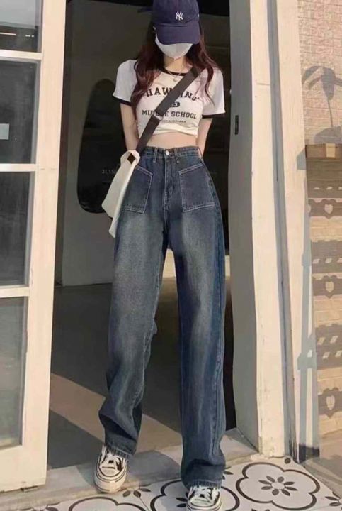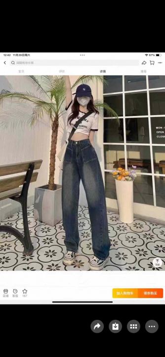 春秋新款宽松高腰洗水棉直筒阔腿牛仔裤独立包装带腰卡...