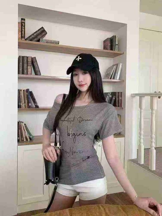 上新全清:6.8一件学院风斜肩字母印花设计感收腰显瘦T恤,[爱心]340件左右...