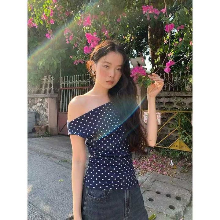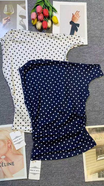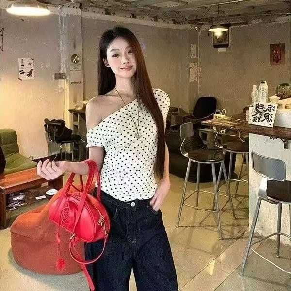 复古甜美波点斜肩修身辣妹上衣,95件左右,蓝色为主,均码,可穿70-120斤,万佳档口货,原包装无瑕疵,实体店品质