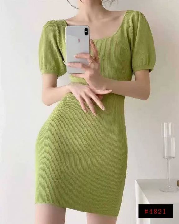 夏季新款法式减龄泡泡袖短袖弹力修身显瘦针织连衣裙,黑色多,独立包装,33...