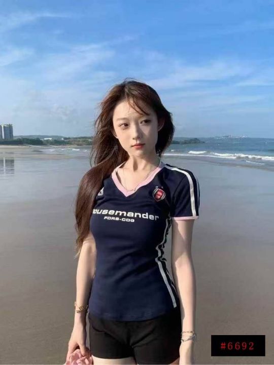 上新全清:8.8一件复古辣妹V领撞色拼接修身显瘦T恤,[...