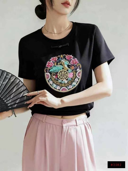 1625件国风重工刺绣中式盘扣拉架棉短袖T恤女,以黑色...