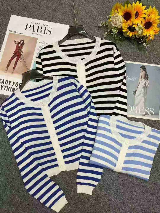秋季新品撞色条纹百搭短款宽松针织毛衣开衫,独立包装...