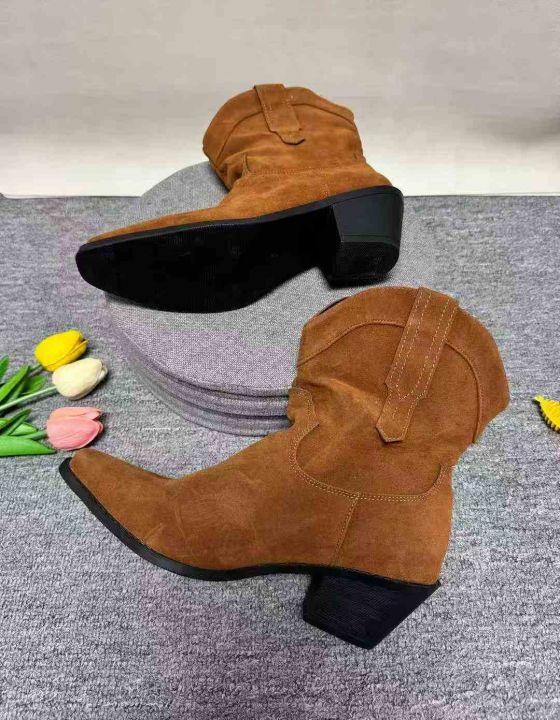 牛皮版~法式尖头西部牛仔靴女2025新款冬季短筒堆堆靴美拉德短靴,数量 80 双,码数 36-43。 图片款,鞋盒包装品质好非常好。全清 16.8。 货号:24862
