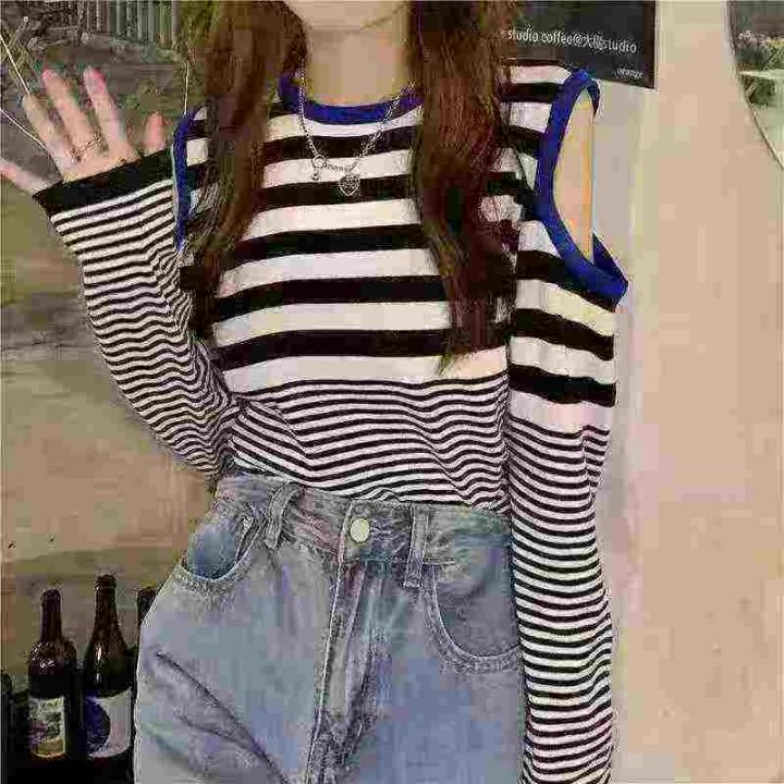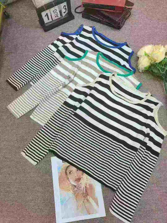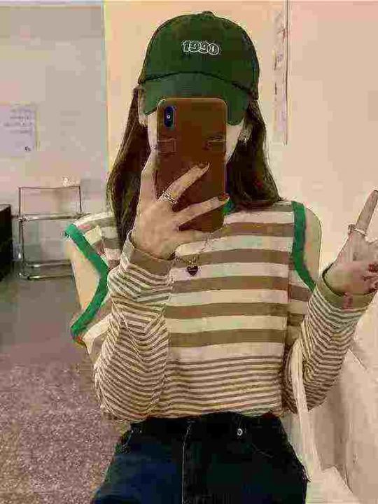 三色入!配色绝绝子~春秋百搭宽松黑白条露肩圆领毛针...