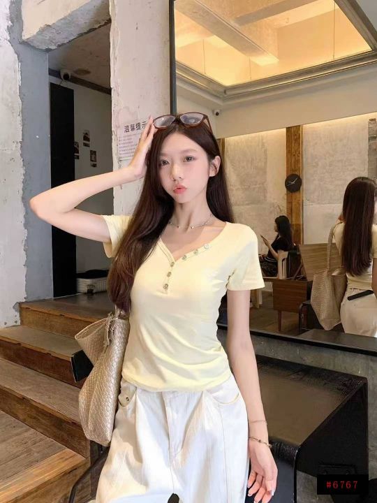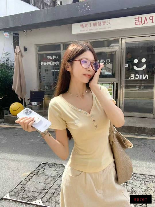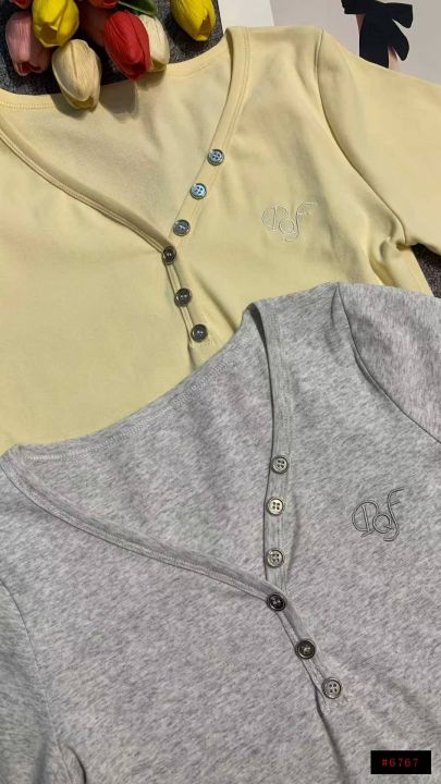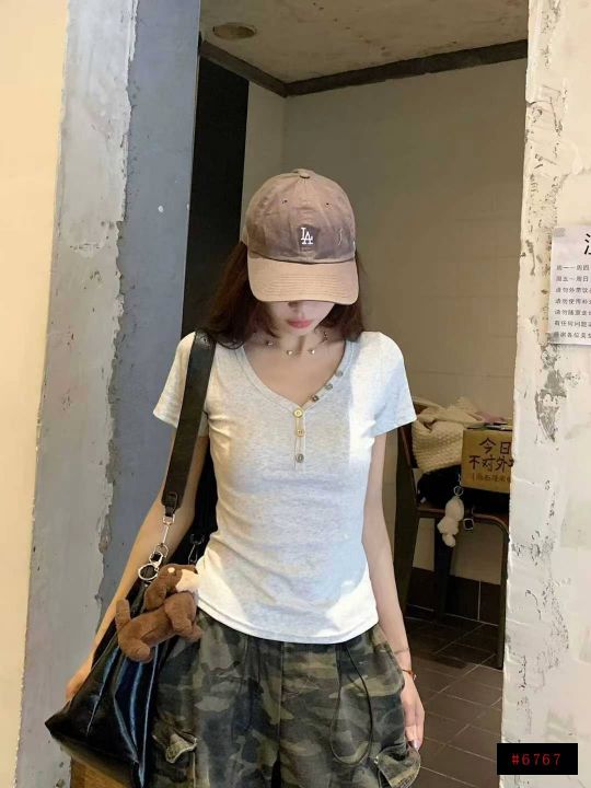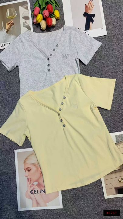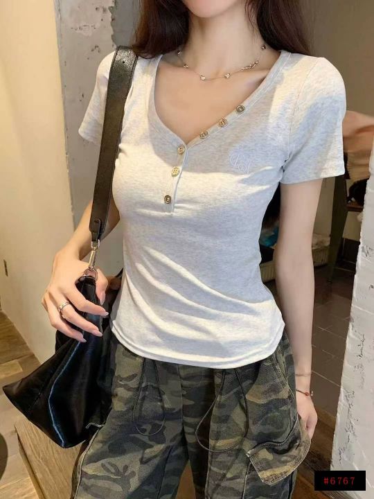 韩版V领扭扣设计字母刺绣修身显瘦上衣,[爱心]130件左右,灰白色为主,款号#1062,码数S-XL,穿70-120斤,万佳档口货,原包装️无瑕疵,[666]实体店品质@_@