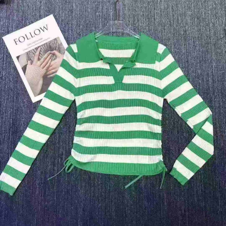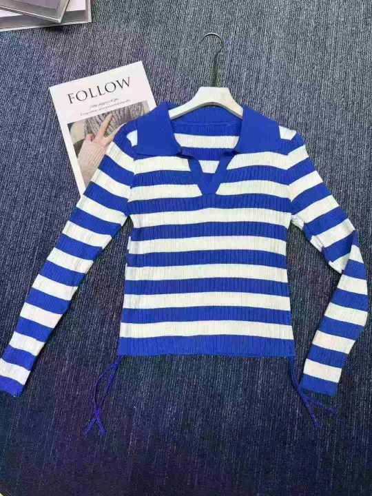 淘宝在售爆款条纹针织衫女春秋款洋气v领毛衣内搭设计感抽绳修身显瘦上衣,总数240件左右,独立原包装,清货7.5元,分货加0.5