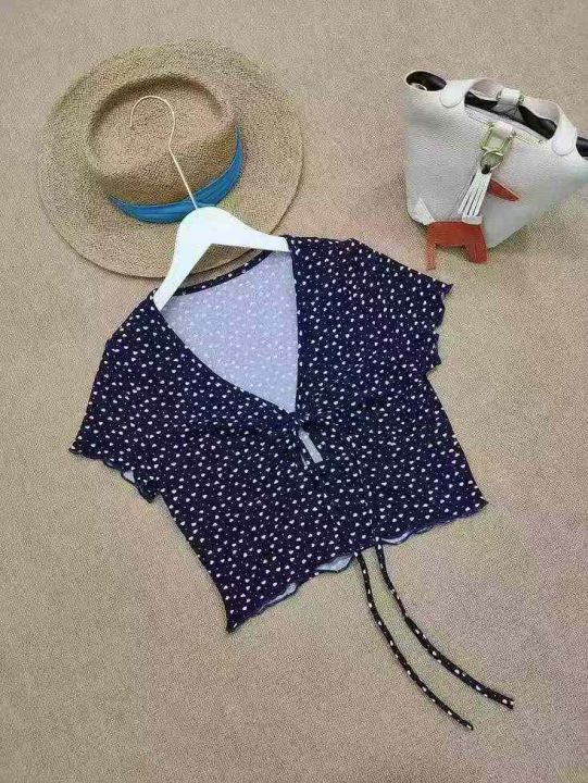 [月亮]:欧美辣妹深V绑带碎花上衣