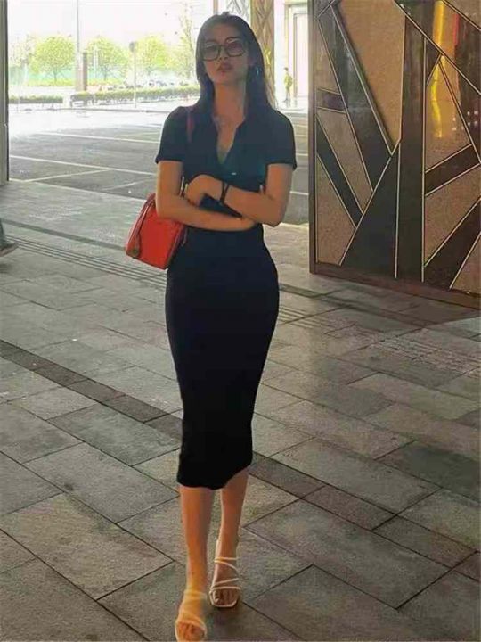 [月亮]:赫本风深V Polo修身包臀针织毛衣连衣裙