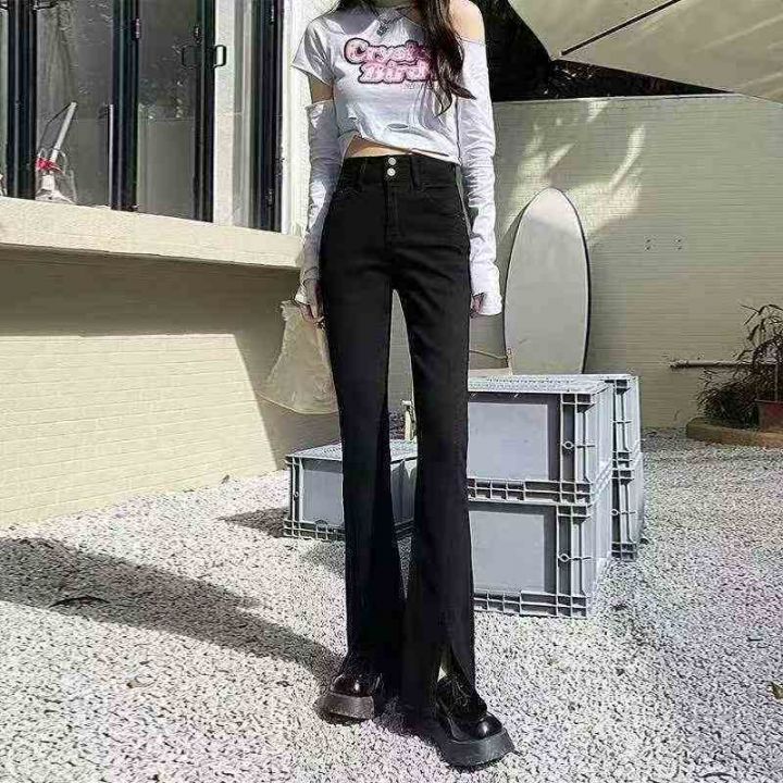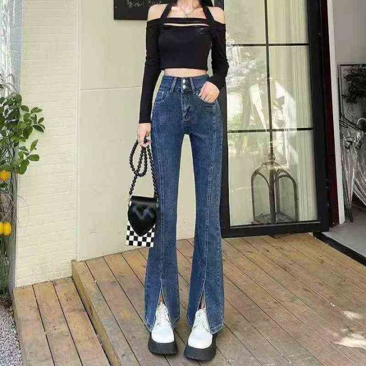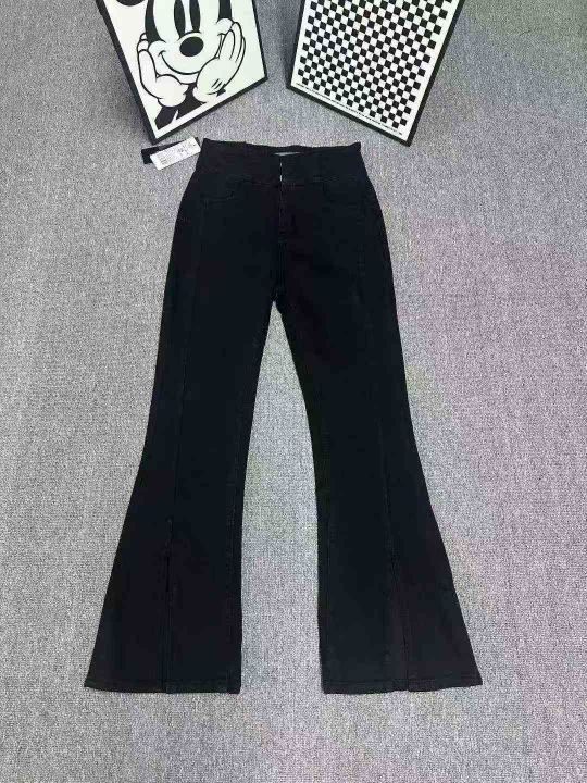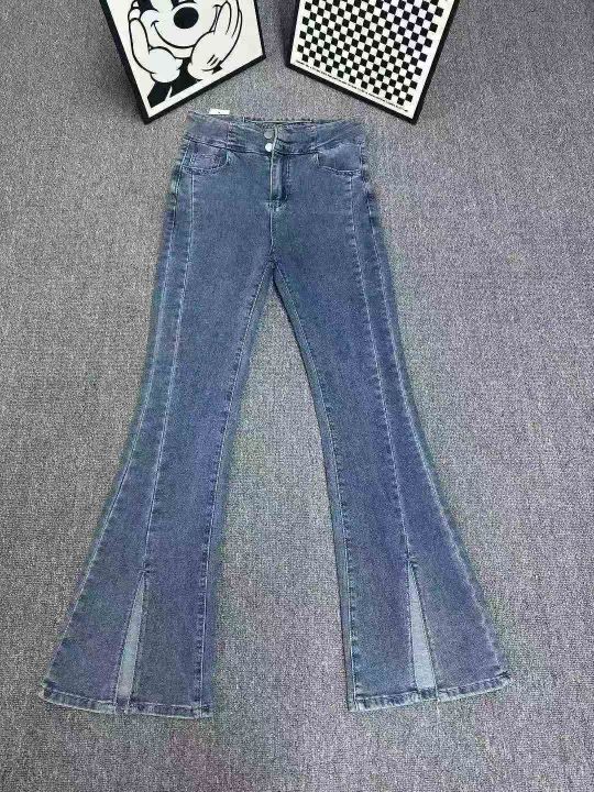高弹力网红高腰喇叭开叉牛仔裤女,单款四色,独立包装...
