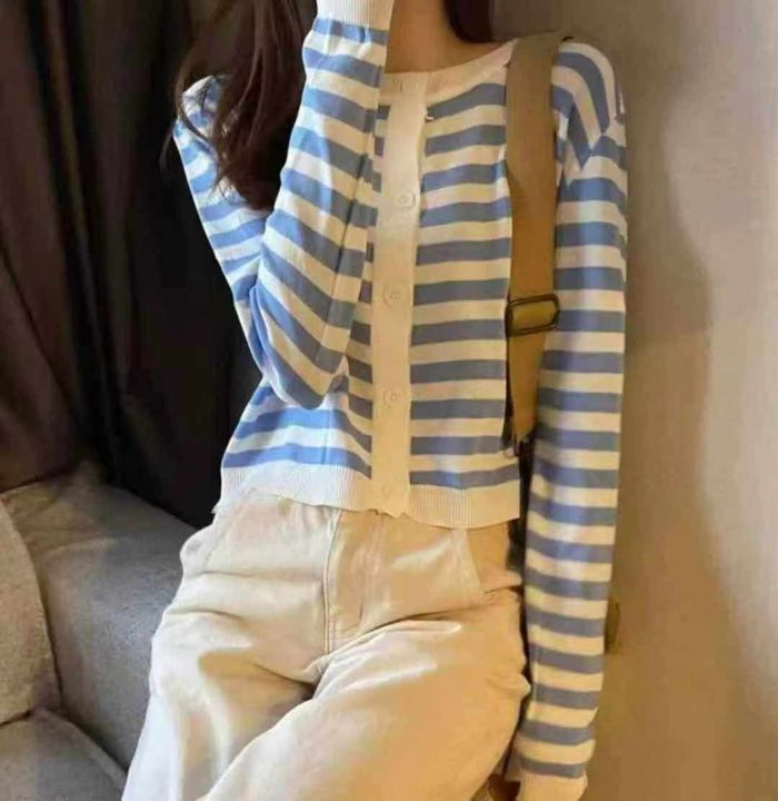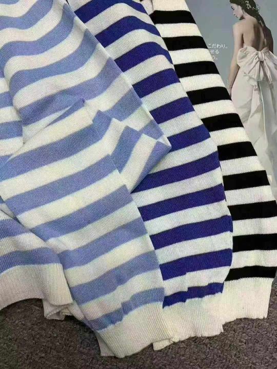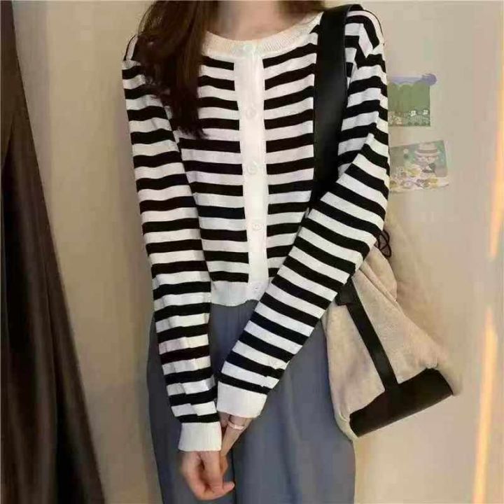 秋季新品撞色条纹百搭短款宽松针织毛衣开衫,独立包装...