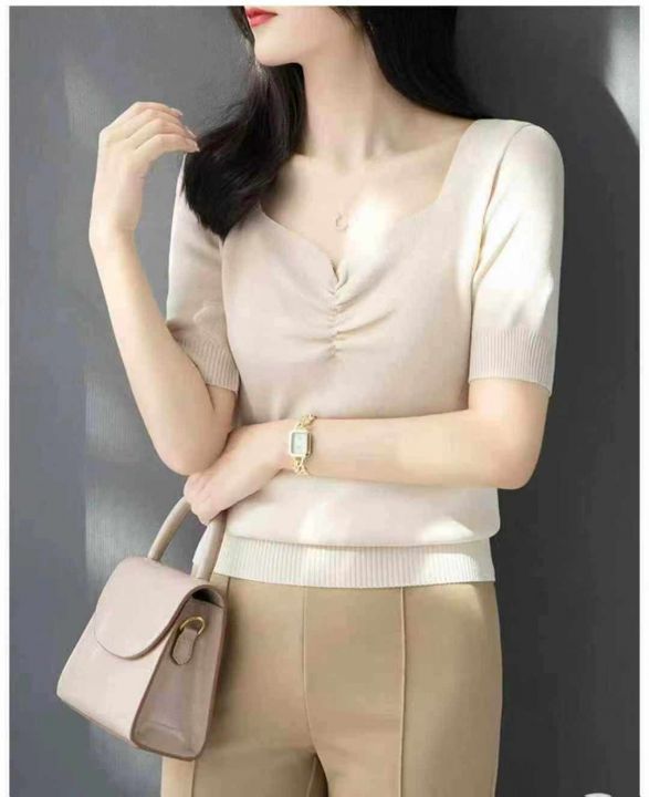 夏季新款温柔风宽松百搭冰丝复古V领针织T桖,独立包装...