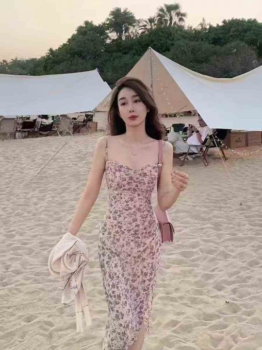 温柔风紫色碎花连衣裙女收腰显瘦小个子吊带裙,模特供参考,整款2色,1到4...