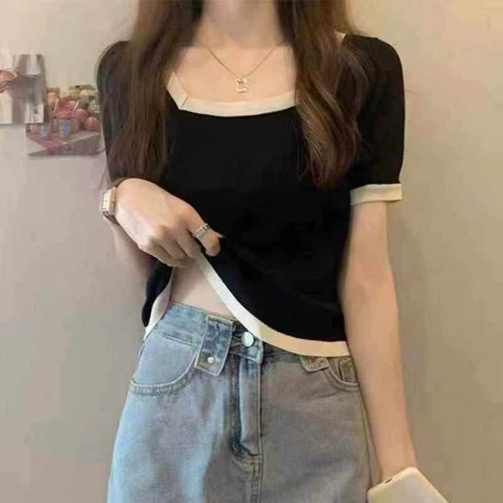 夏季新款大码宽松弹力显瘦方领冰丝针织短袖,独立包装,均码面料柔软舒适弹力,宽松版,单款4色米色黑色多,4600件,全清5.9元超低价秒杀!分货加一!