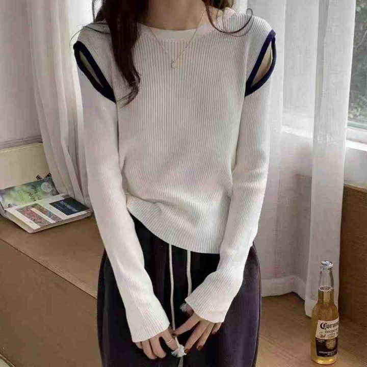 韩系气质简约撞色镂空修身针织上衣女秋冬百搭显瘦可外...
